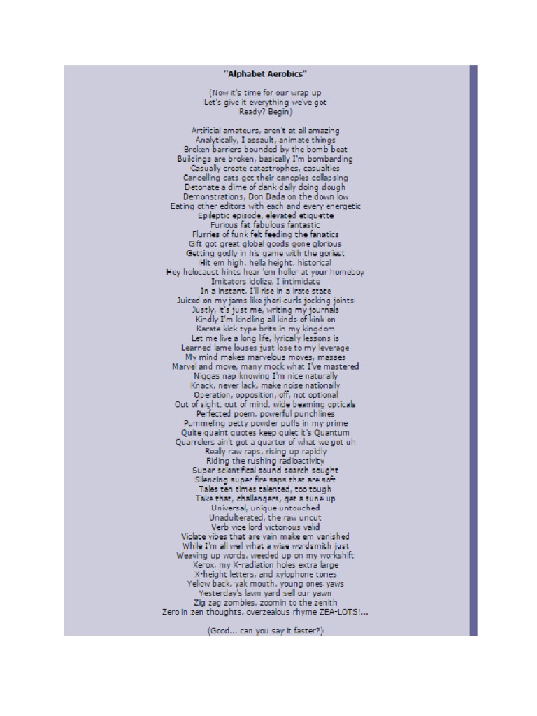 Check out my other channel: It features gift of gab tearing up a simple beat (provided by cut chemist rather . Alphabet aerobics lyrcis (daniel radcliffe). Blackalicious also reworked the song with . If playback doesn't begin shortly .